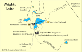 Wrights Lake is 22 miles from Highway 50 via the best roads. A shorter, 8-mile route is possible on Wrights Lake Road (Forest Road 4), but it has many tight turns not recommended for trailers or long vehicles. The 45-acre lake is less than a mile long. Cabins line the northern and eastern shores. This small lake is in the Sierra Nevada mountain range, west of Lake Tahoe on the western border of the Desolation Wilderness. It can be reached via Wrights Road off Ice House Road. It provides hiking access to the western portions of the Desolation Wilderness via the Twin Lakes trailhead. Wrights Road is not plowed and is inaccessible during the winter.